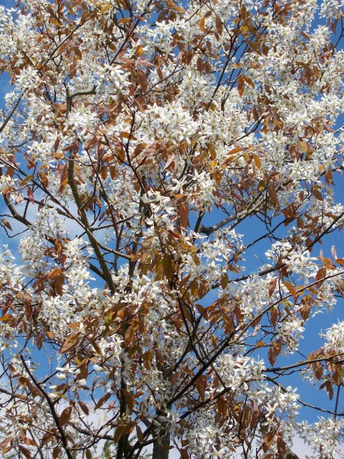 Dieser locker verzweigte, aufrechte, im Alter malerisch überhängende Großstrauch, erfreut uns im Frühjahr mit reichlich weißen Blüten und kupfrigem Blattaustrieb, im Sommer mit blauschwarzen, essbaren Beeren und im Herbst mit brennend orangeroter Laubfärbung. Ein besonders vielseitig verwendbares Garten-, Park- und Straßengehölz auch ideal zur Kübelkultur.