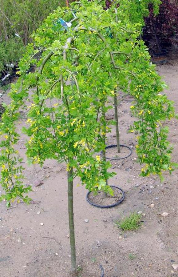 Es handelt sich um eine seltene Hängeform des gewöhnlichen Erbsenstrauchs bei dem die Zweige mit den Jahren bis auf den Boden herabhängen. Im Mai erscheinen zahlreiche gelbe Blütenbüschel.