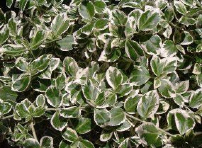Diese immergrüne, kontrastreiche Kriechspindel ist ein sehr anspruchsloser Bodendecker. Auffallend sind die innen grün und außen weiß gerandeten Blätter. Die weissbunte Krichspindel wächst etwas langsam, ist aber gut deckend.