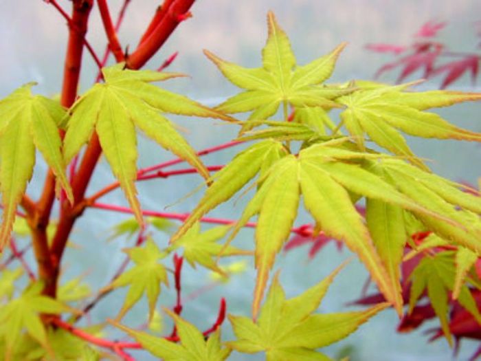 Der besonders schlank und aufrecht wachsende Acer palmatum 'Sangokaku' beeindruckt vor allem wegen seiner ganzjährig, korallenrot gefärbten Rinde, die im Winter besonders gut zur Geltung kommt. Seine sonst hellgrüne Belaubung verwandelt sich zum Herbst in ein leuchtendes Gelborange bis Hellrot. Ein wertvoller und außergewöhnlicher Ahorn für kontrastreiche Pflanzungen.