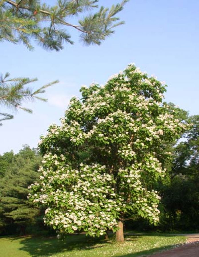 Der Trompetenbaum bildet ausgesprochen große, herzförmige Blätter. Die zahlreichen, weissen, trompetenförmigen Blüten stehen in aufrechten, vielblütigen Rispen zusammen. Im Anschluss bilden sich die bis zu 40 cm langen Schoten, die den Baum auch im Winter noch exotisch wirken lassen und ihn deshalb zu einer Besonderheit unter den Laubgehölzen macht.