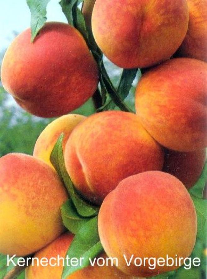 Die Pfirsichsorte 'Kernechter vom Vorgebirge' ist eine späte, selbstfruchende Sorte, mit regelmäßig hohen Erträgen. Dieser Pfirsich eignet sich speziell für rauhe Lagen, auch zeichnet er sich durch seine große Toleranz gegenüber der Kräuselkrankheit aus. Die Früchte sind behaart, gelb und sonnenseits rot gefärbt. Das Fruchtfleisch ist grünlichweiß, saftig, süß mit angenehmem Aroma und gut steinlösend. Die Früchte reifen im August und eignen sich am besten für den Frischverzehr oder zur Konservierung.