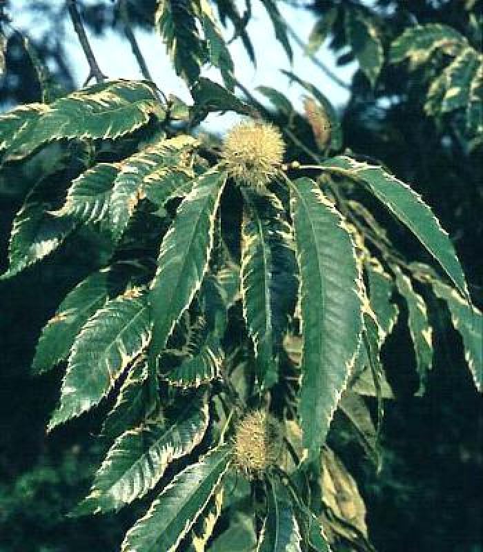 Bei der weissbunten Edel-Kastanie handelt es sich um eine seltene Art der Marone mit auffallend weiß bis creme gerandeten Blätter, die etwas kleiner sind als bei 'Castanea sativa'. Der Wuchs ist ebenfalls etwas schwächer, dennoch entwickelt sich daraus mit den Jahren ein mittelgroßer Baum mit hohem Zierwert der im Einzelstand am besten zur Geltung kommt. Wie alle Maronen blüht und fruchtet auch diese Sorte, allerdings ist die Menge und Qualität nicht mit veredelten Bäumen vergleichbar.