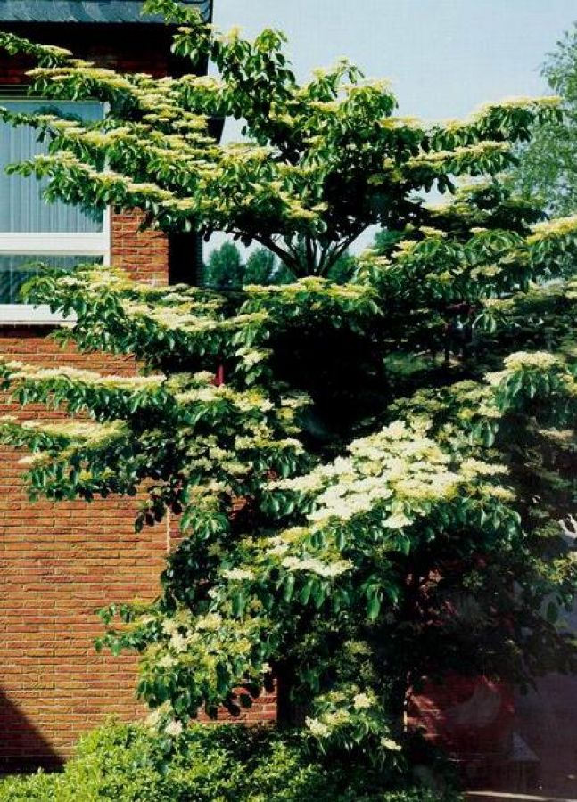 Der dekorative Etagen- oder Pagoden-Hartriegel wächst als Großstrauch oder Kleinbaum. Typisch sind die waagerecht, etagenförmig, übereinander angeordneten Äste, die sich oft weit nach außen erstrecken. Im Kontrast zum dunkelgrünen Laub, entfalten sich im Juni die großen gelblich-weißen, schirmartigen Blüten, woraus sich bis zum Herbst die zahlreichen blau-kugeligen Beeren entwickeln. Der Hartriegel mit seinem aussergewöhnlichen Wuchs ist ein markantes Gestaltungselement.