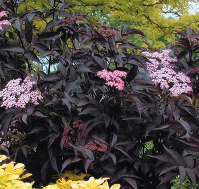 Sambucus 'Black Beauty' ist eine neue, attraktive Holundersorte. Die Belaubung ist meist von Frühjahr bis in den Herbst auffallend dunkelrotbraun-rotschwarz, leicht glänzend. In sehr schönem Kontrast dazu, stehen die zahlreichen rosaweißen, nach Zitrone duftenden, schirmartigen Blüten. Die eßbaren Beeren sind violettschwarz, sie lassen sich wie andere Holundersorten verwerten, sind jedoch nicht so zahlreich wie beim gewöhnlichen Holunder. Ein außergewöhnlicher Zierstrauch für kontrastreiche Pflanzungen mit helllaubigen Gehölzen.